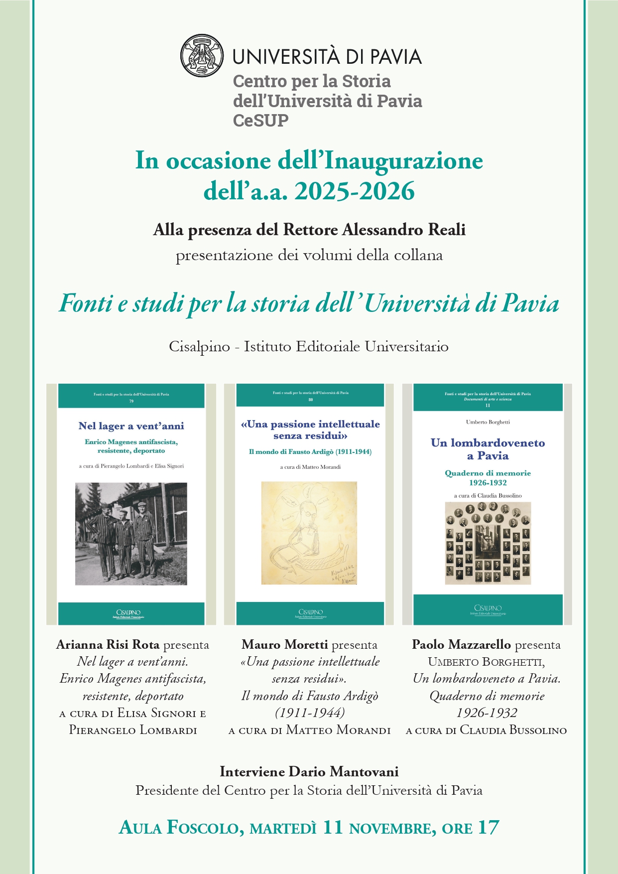 pubblicati dal CeSUP nel corso dell’ultimo anno nella collana Fonti e studi per la storia dell’Università di Pavia. L’evento si terrà nell’ambito delle cerimonie per l’inaugurazione dell’anno accademico 2025/2026, in presenza del Magnifico Rettore Alessandro Reali. Interverrà Dario Mantovani, Presidente del Centro per la Storia dell’Università di Pavia.