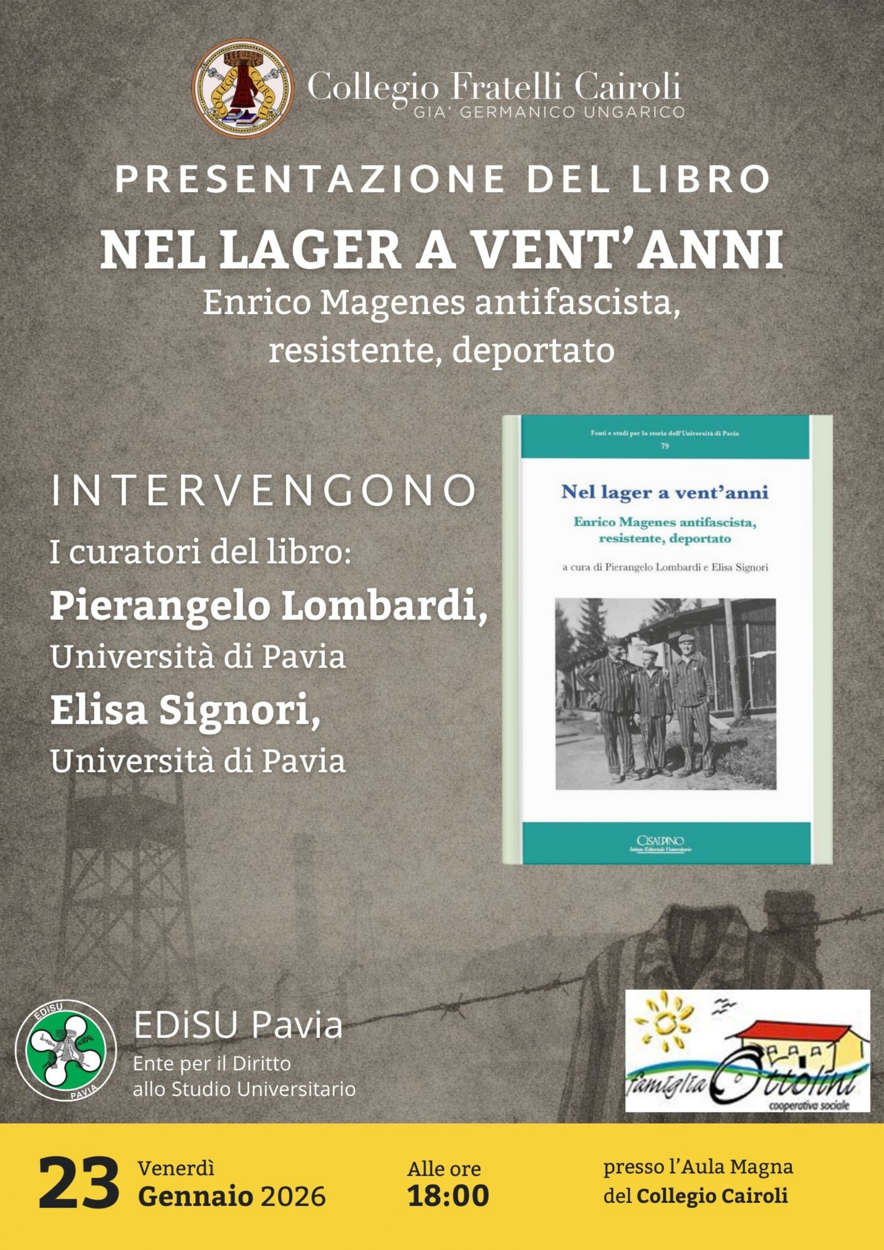 Venerdì 23 gennaio 2026, alle ore 18:00, presso l’Aula Magna del Collegio F.lli Cairoli di Pavia, si terrà la presentazione del libro pubblicato dal Centro per la Storia dell’Università di Pavia “Nel lager a vent’anni: Enrico Magenes antifascista, resistente, deportato”, a cura di Pierangelo Lombardi ed Elisa Signori.